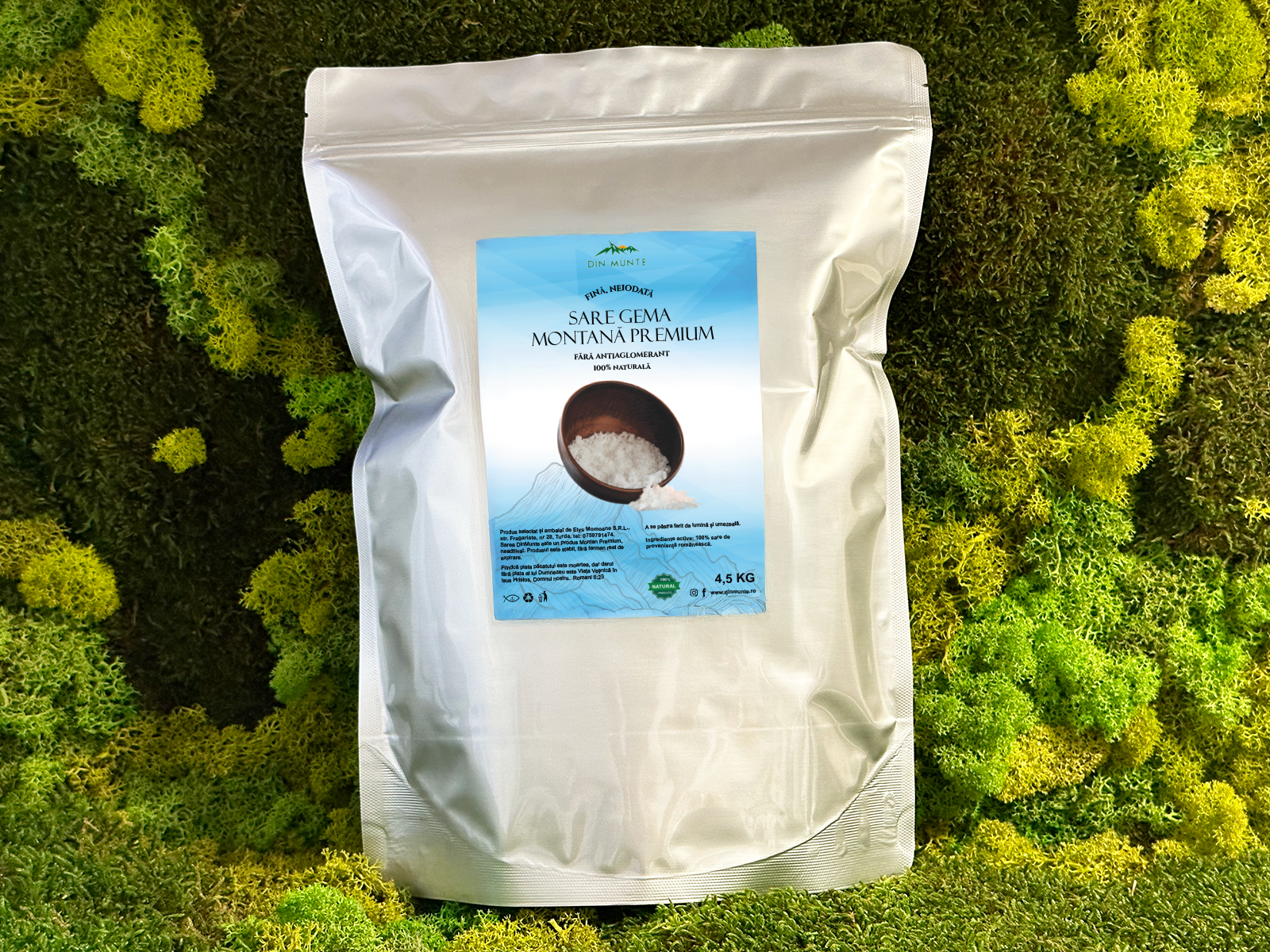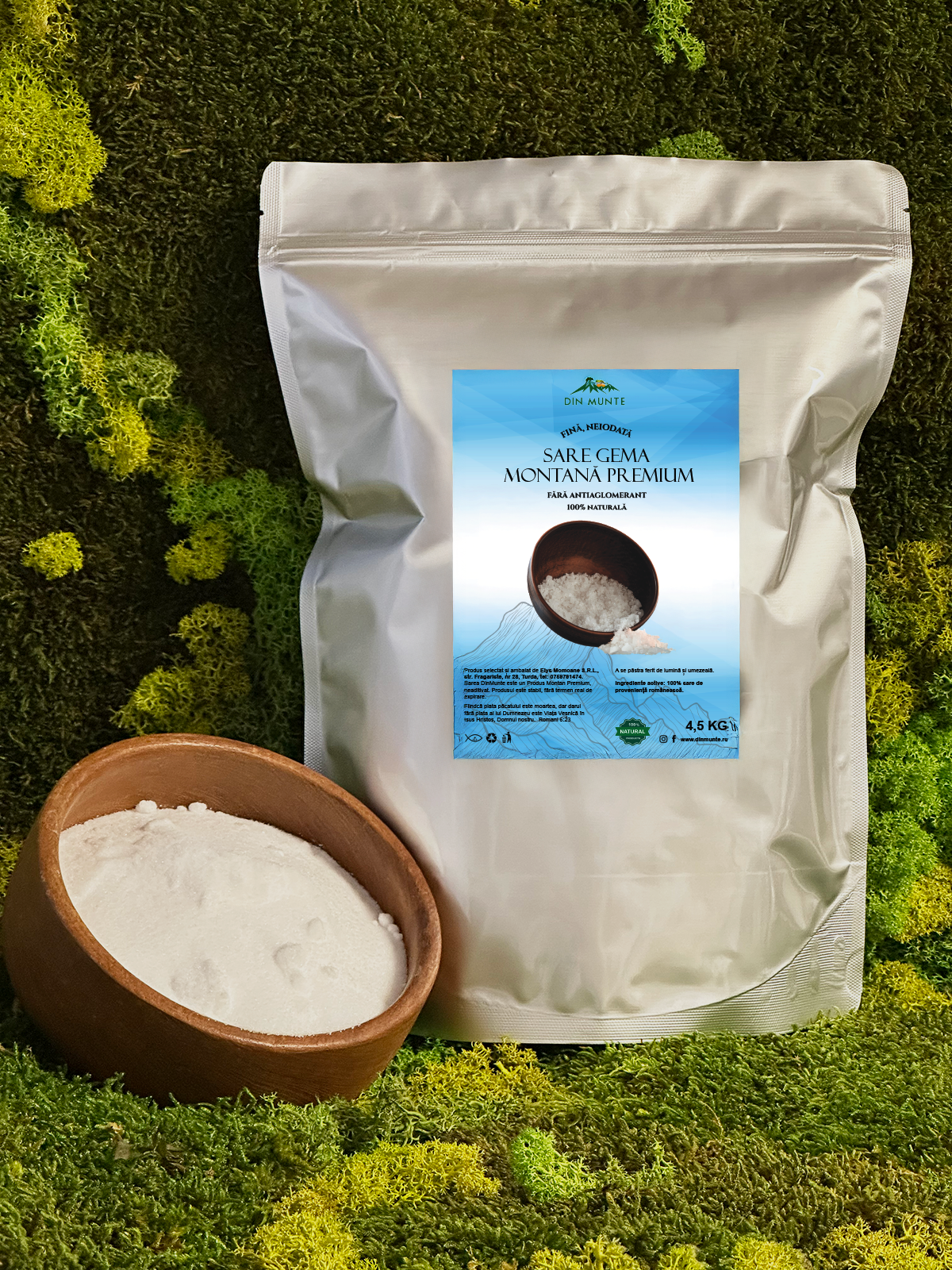 Sarea premium, neiodată și fără antiaglomerant, este extrasă direct din rocă, dintr-un zăcământ natural. Procesată, prelucrată, selectată și ambalată manual, aceasta conține 98-99% NaCl. La DinMunte.ro găsiți singura sare premium fără iod și fără ferocianură de potasiu.